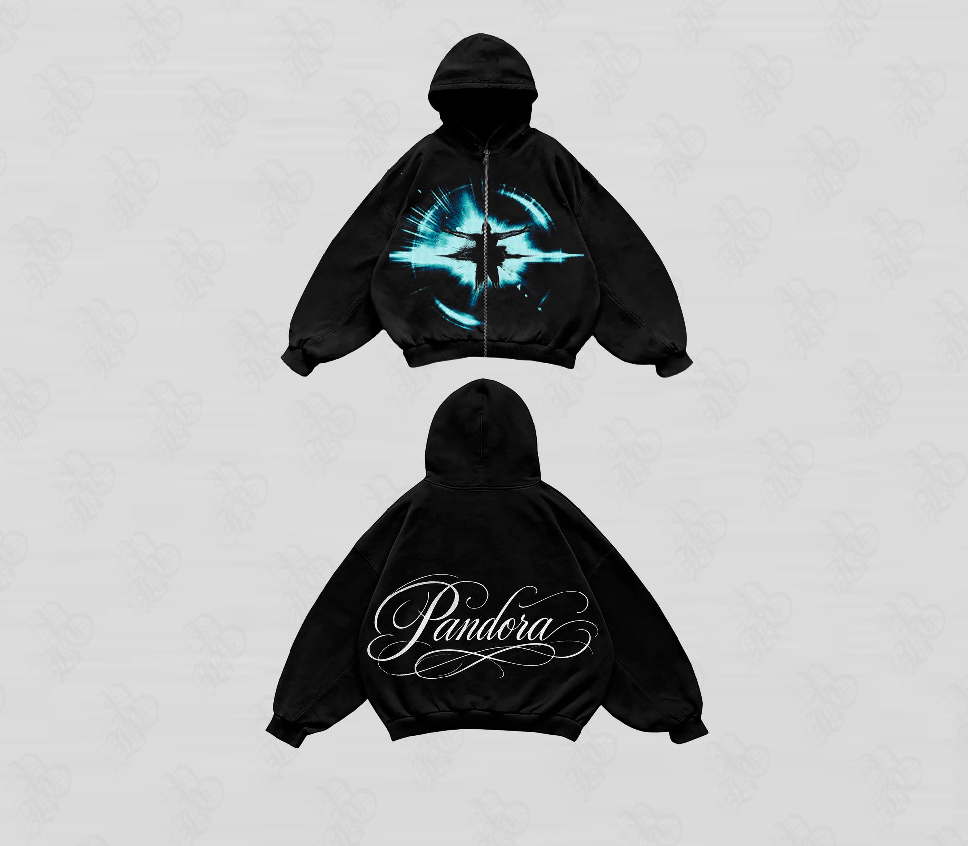 Una prenda que trasciende lo convencional: el símbolo energético desplegado en azules profundos actúa como una ventana dimensional, una fractura visual que comunica a los observadores perspicaces. La espalda presenta el logo Pandora en tipografía refinada, estableciendo un contraste deliberado con la intensidad del diseño frontal.